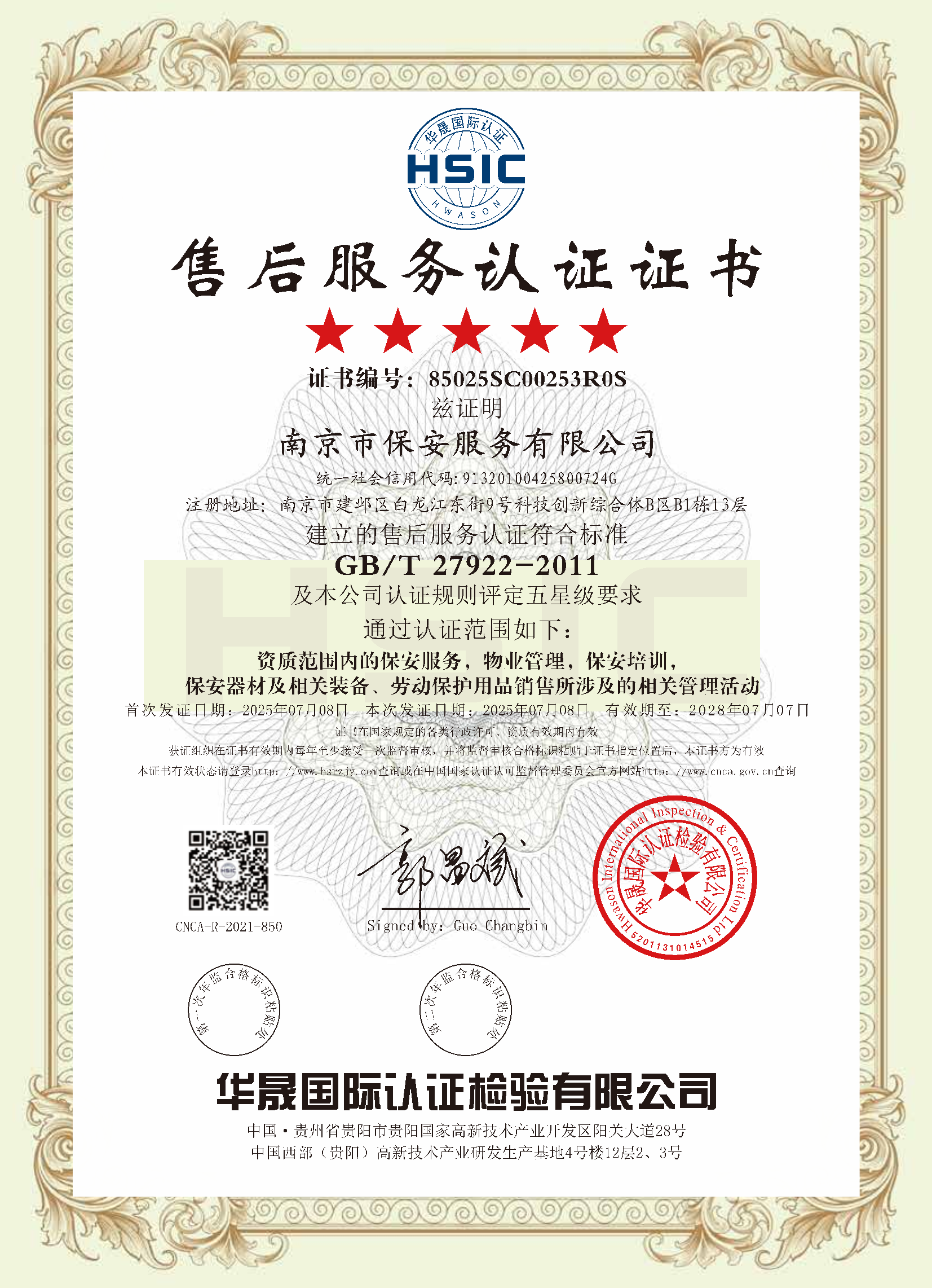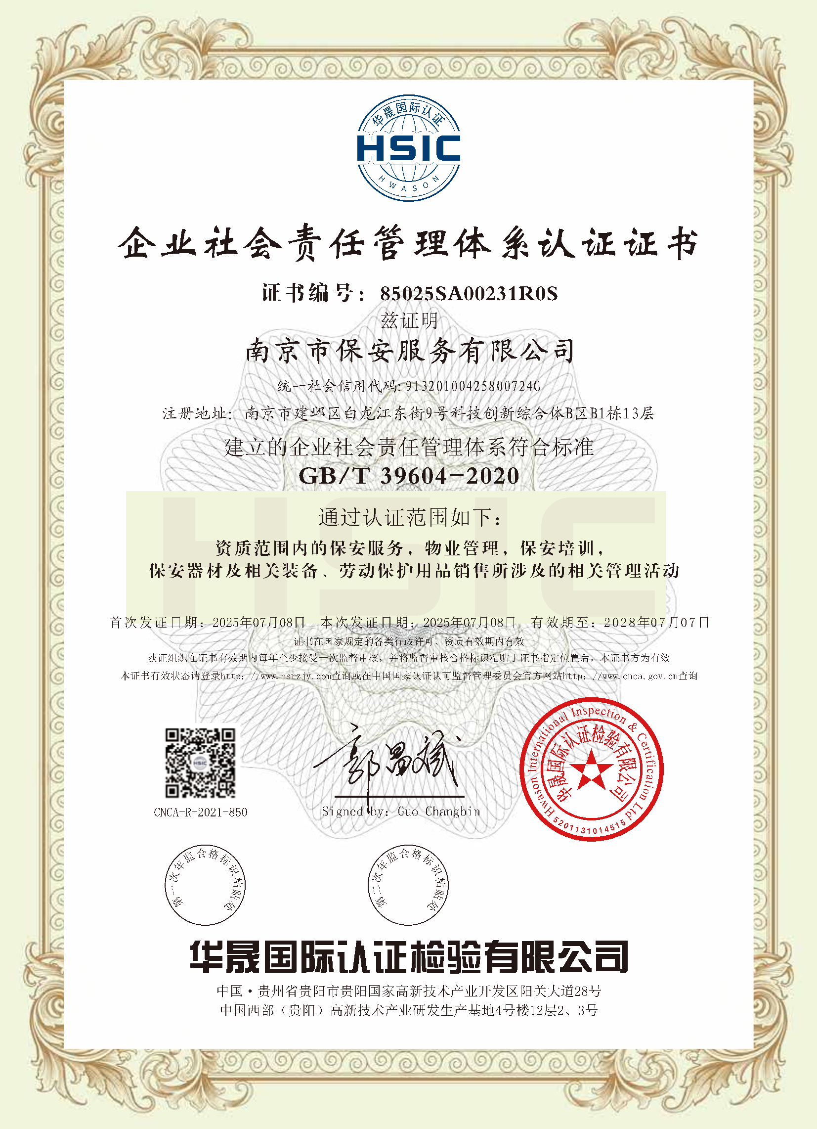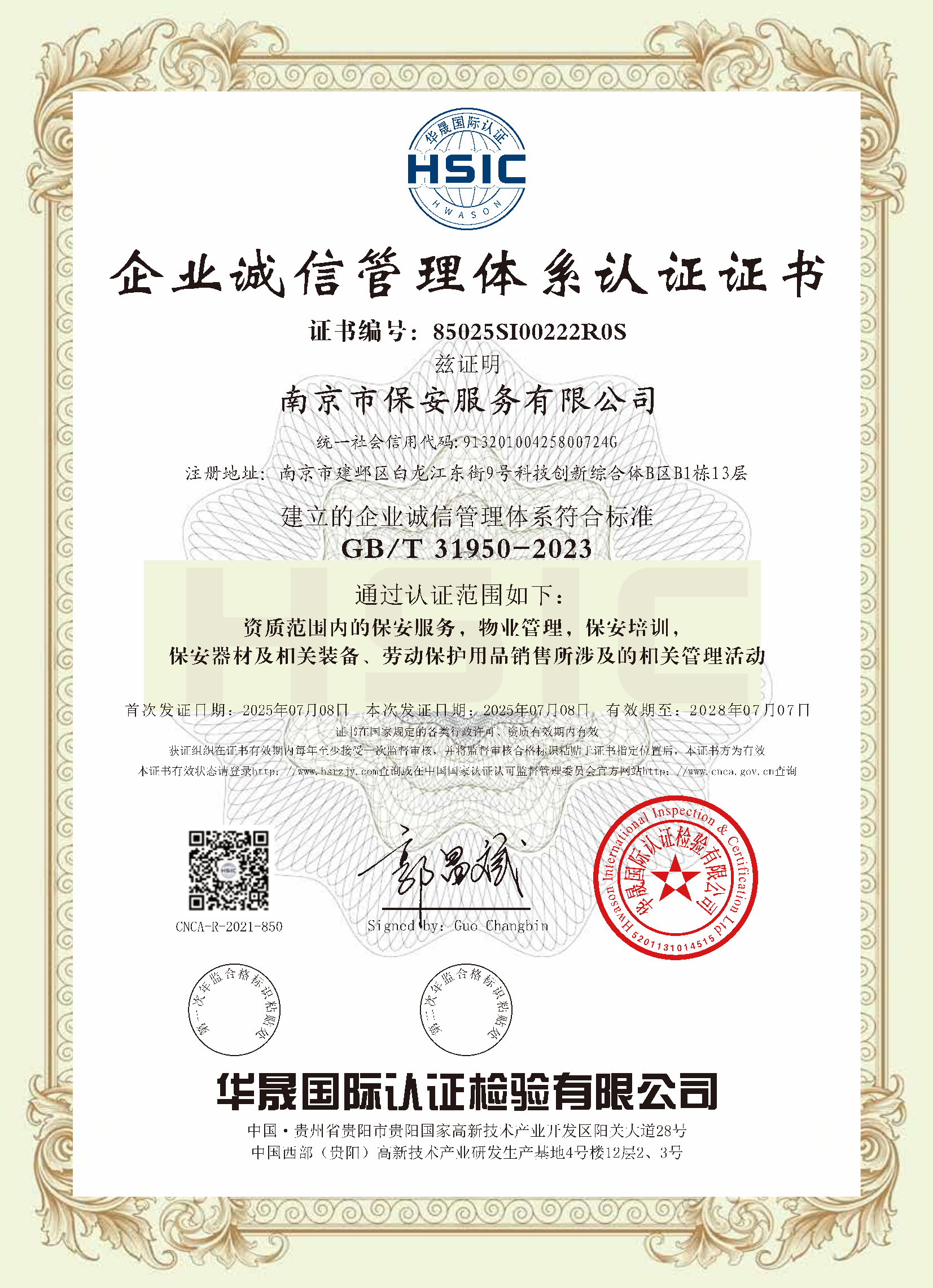 祝賀:南京市保安服務(wù)總公司通過企業(yè)誠信管理體系認證和企業(yè)社會責(zé)任管理體系認證[07-16]
